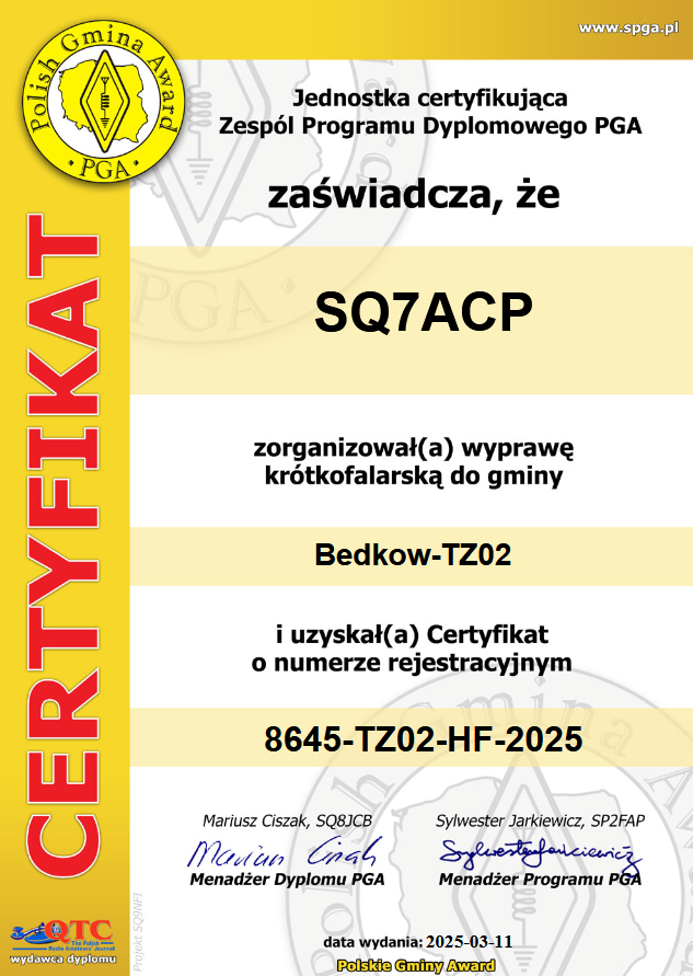 108 QSO w paśmie 40m, 57 QSO w pasmie 20m. Całkowity czas aktywacji to godzina 56 minut. Najważniejszy cel wyprawy zaliczony,czyli aktywacja gminy 🙂 co potwierdza poniższy dyplom.