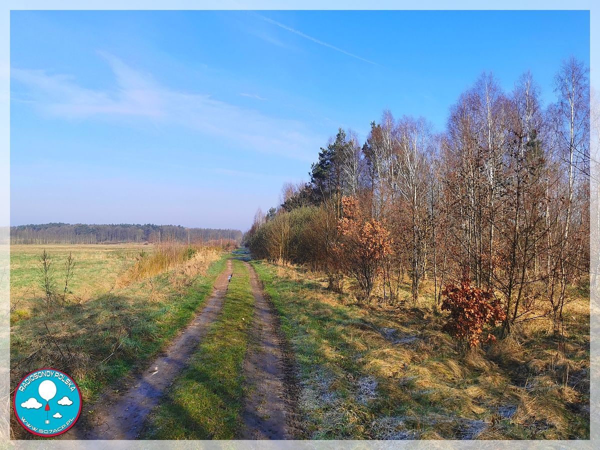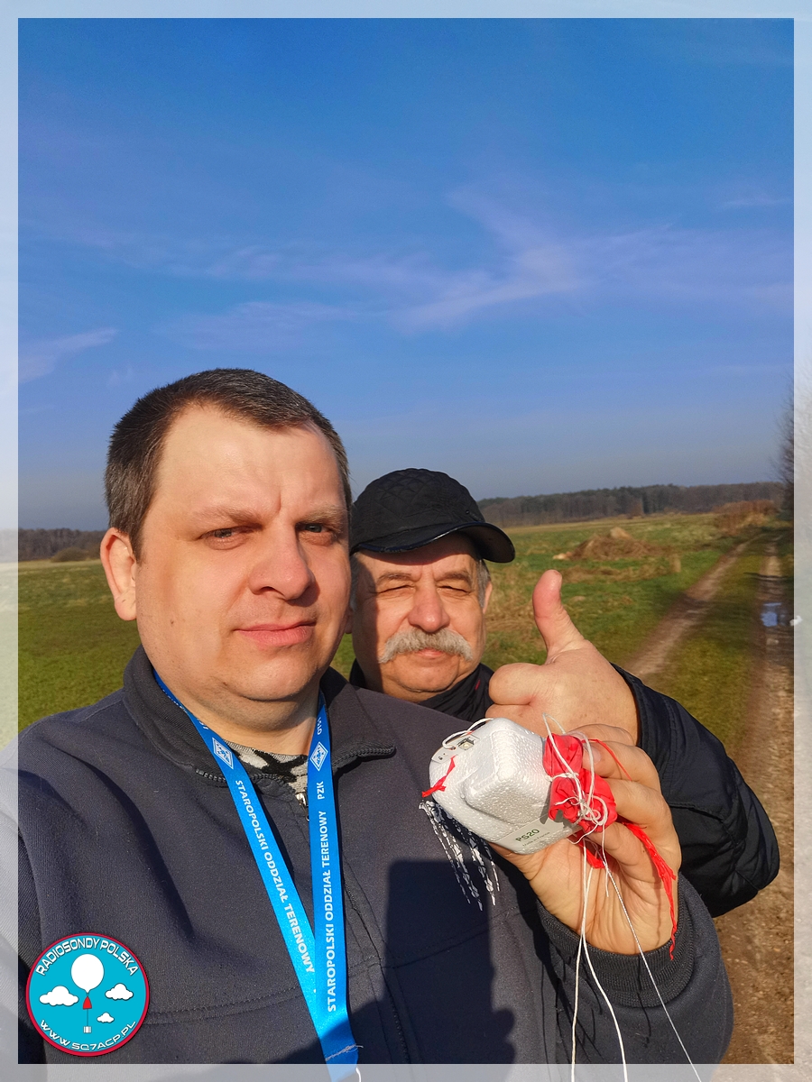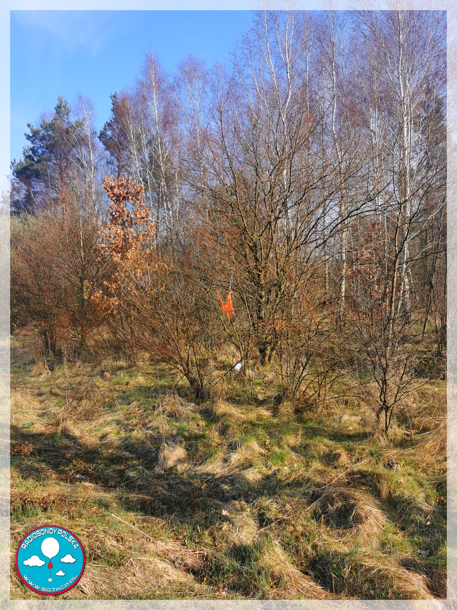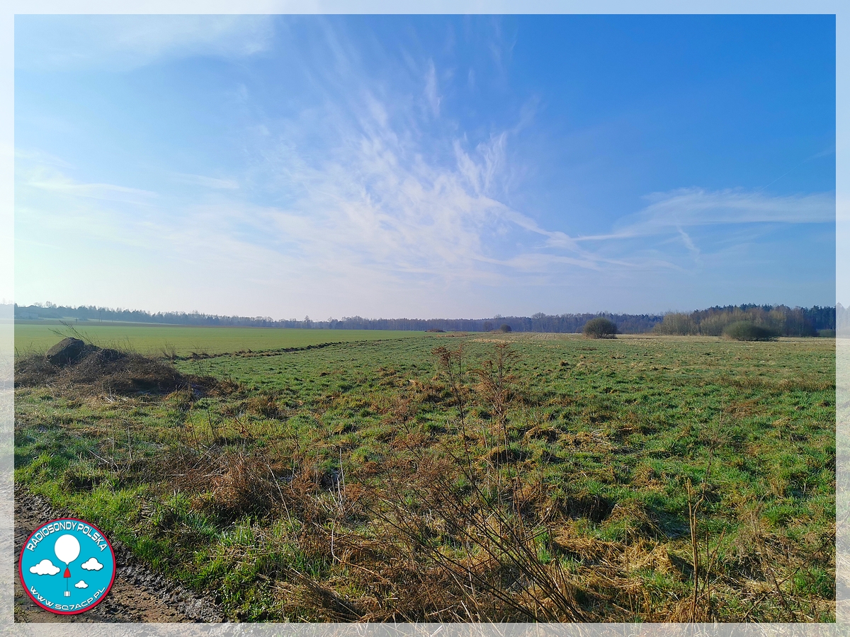 Na ostanie tygodnie marca jest wydany Notam na pilotki z lotniska w Nowym Glinniku. 20 marca po godzinie 6 rano skaner zatrzymał się wydając charakterystyczne pikanie. Początkową radość szybko zgasiły jednak predykty, wiatry górą (koło 10km nad ziemią) są spore i dochodzą do 100 km/h. Sonda za to szybko się wznosi więc jest szansa że może szybciej pęknie. Tak tez się stało na wysokości niemal 12km, nad miejscowością Żarnów. Zapadła szybka decyzja o wyjeździe, w ten piękny słoneczny, mroźny poranek. W nocy temperatura spadła do -3 stopni, więc i szyby w aucie przymarznięte. Zabraliśmy ze sobą ekwipunek, ttgo, radio, antenę kierunkową z tłumikiem i ruszamy w trasę drogą 713. Przed nami jakaś godzina drogi, po drodze w radio słychać, że mają być jakieś blokady rolników na drogach, więc boczkiem , boczkiem i lecimy. Ruch na ulicach w sumie znikomy, więc w miarę szybko jesteśmy już w pobliży sondy. Słychać ja już z odległości 2km, co sugeruje że może wisieć i raczej wisi. One mają bardzo słaby sygnał raczej jak M20. Droga polna prowadzi nas pod samą sondę, jakby upadła bliżej z 3m drogi to prosto z auta by się udało podjąć 🙂 TTGO zdekodowało pozycję bezbłędnie, sam natomiast nie mógł początkowo złapać swojej pozycji i pokazał śmieszną odległość do sondy ponad 4 tysięcy km hahaha.