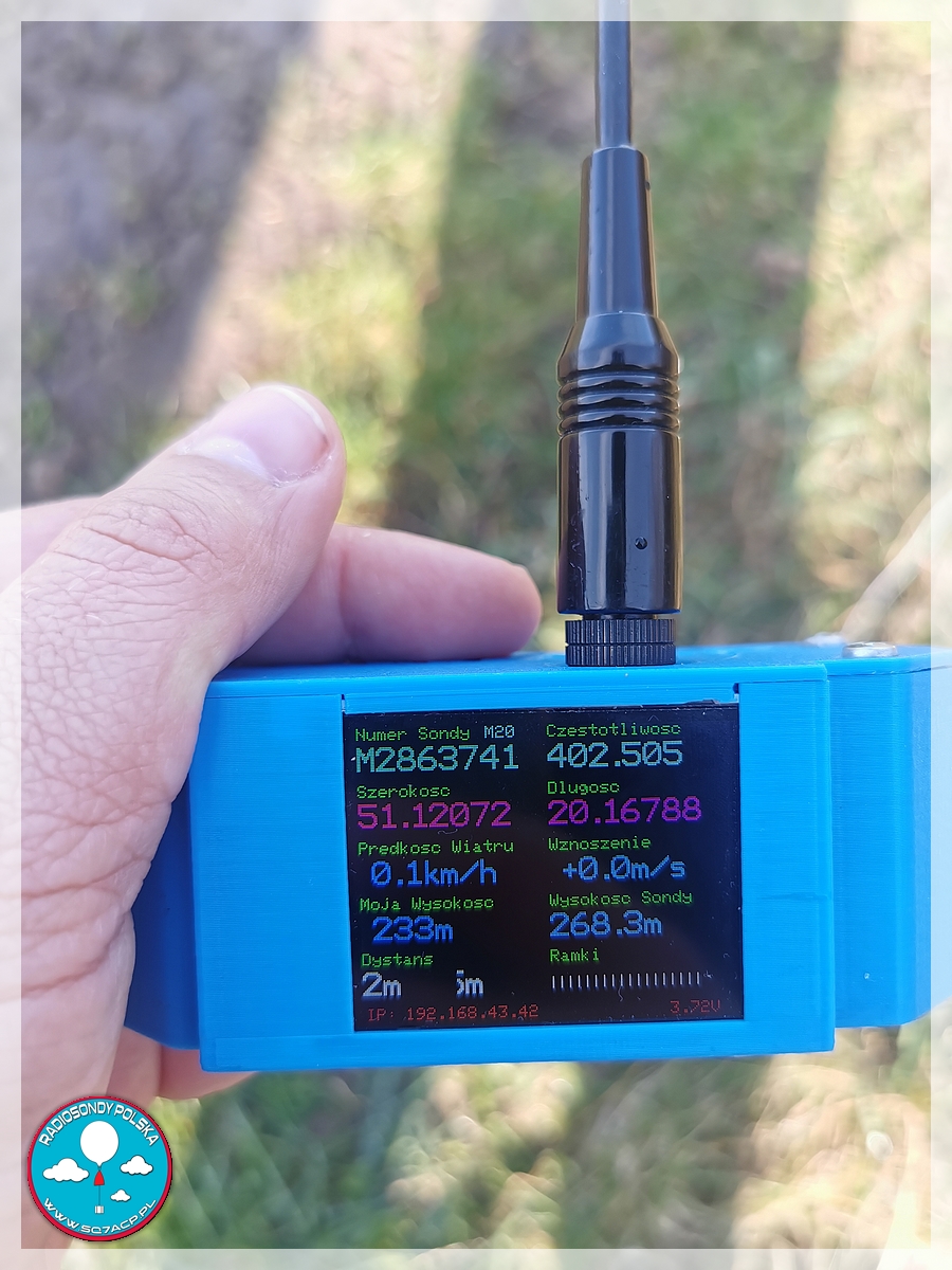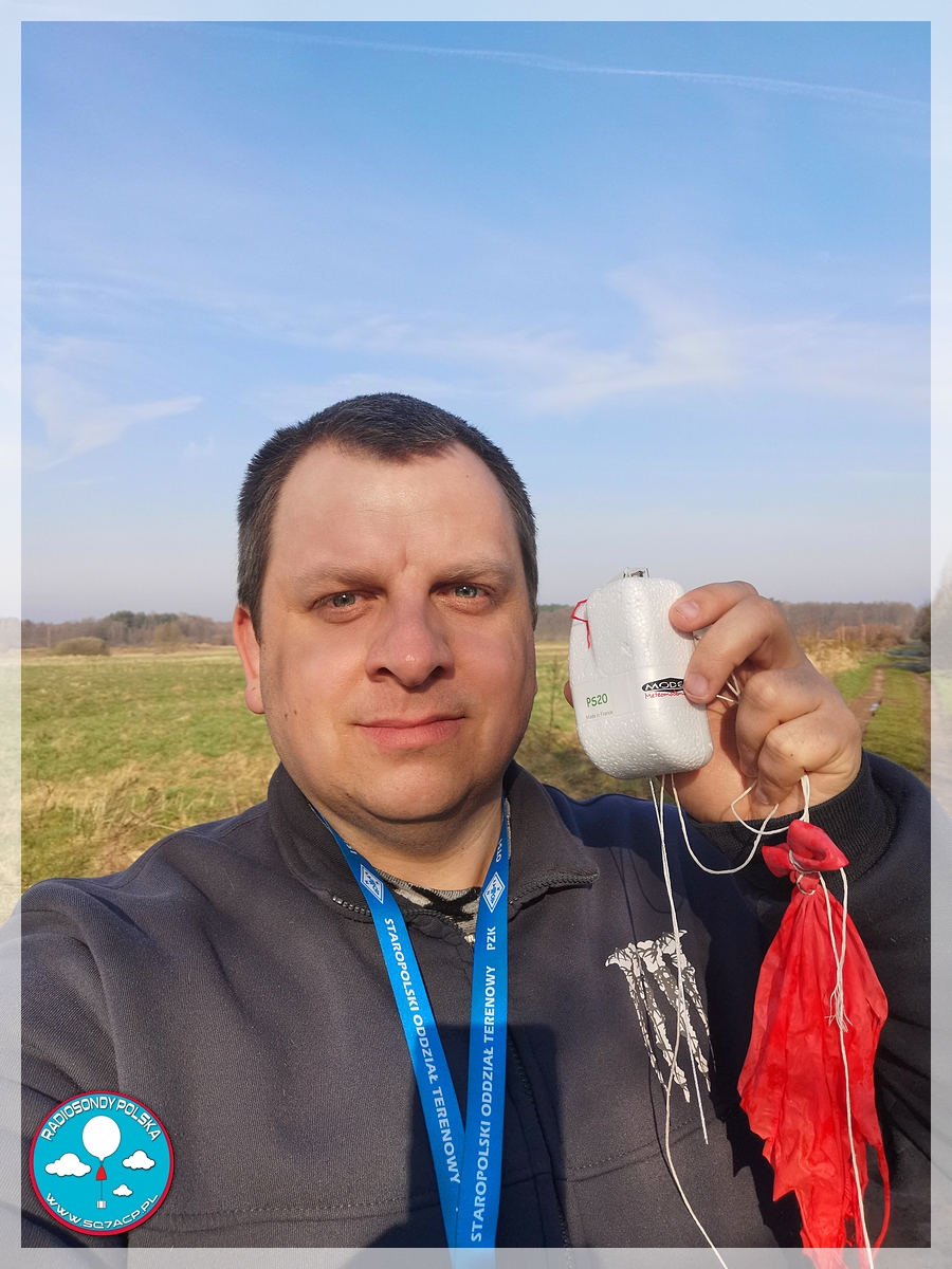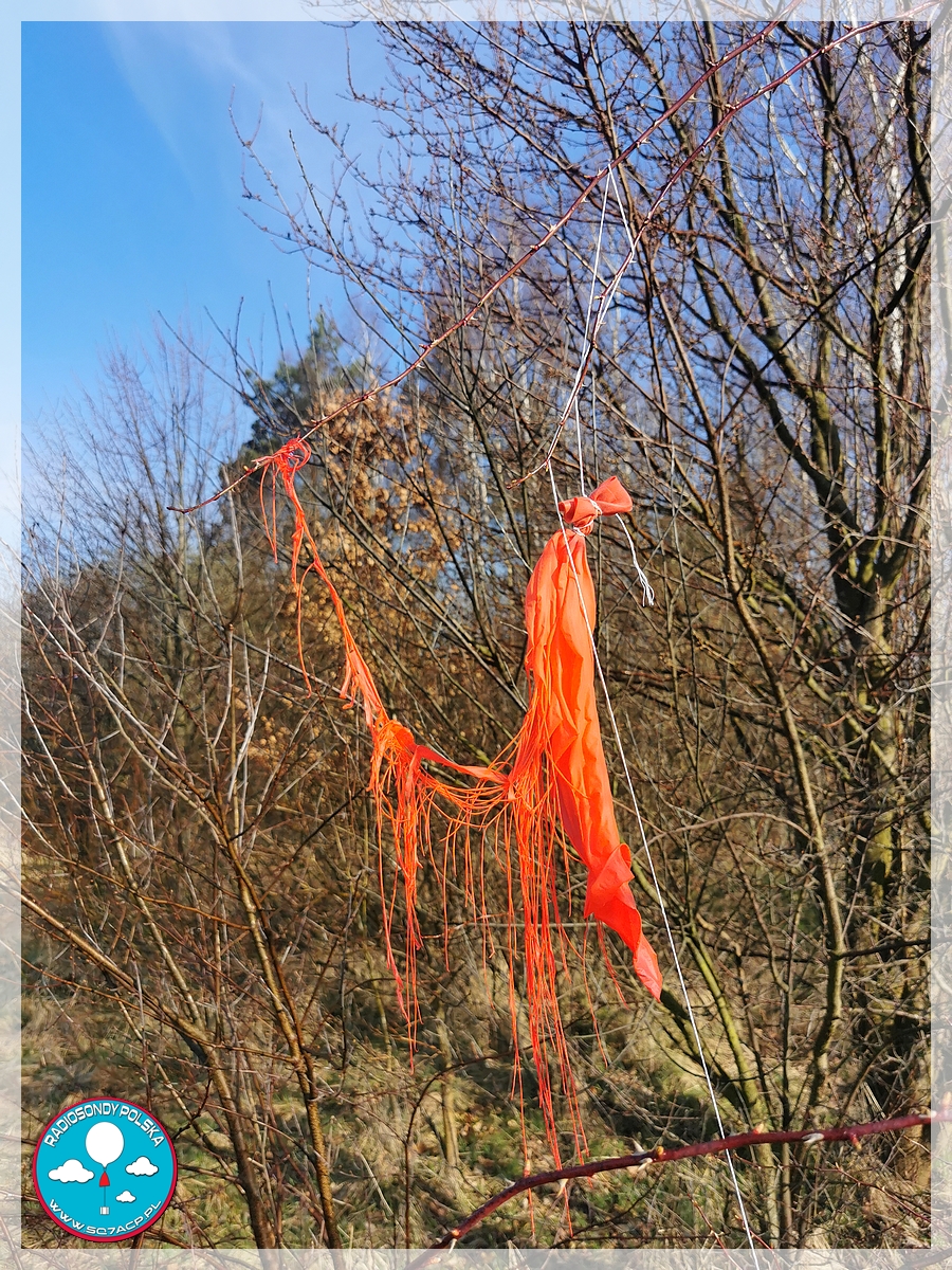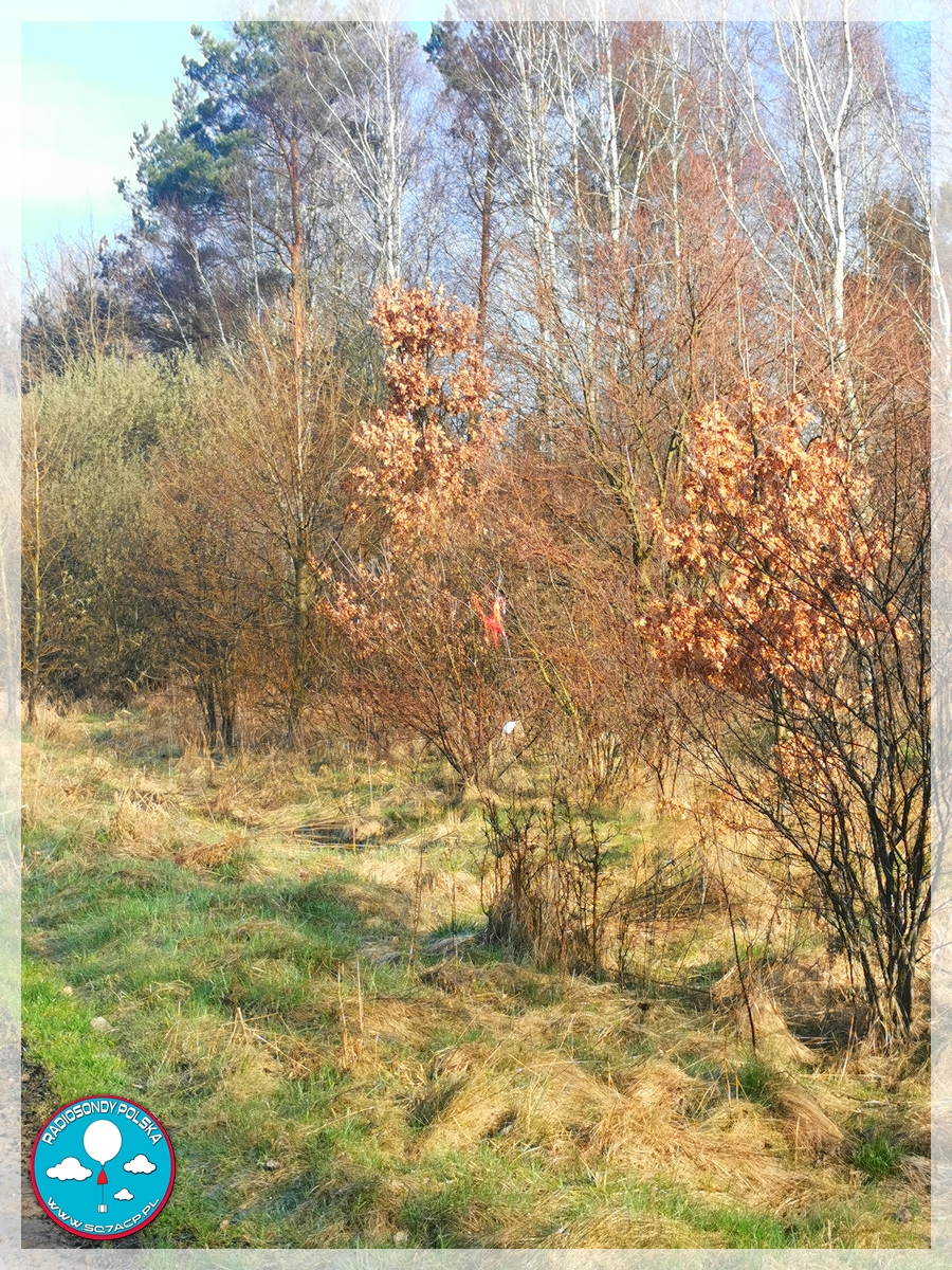 Na ostanie tygodnie marca jest wydany Notam na pilotki z lotniska w Nowym Glinniku. 20 marca po godzinie 6 rano skaner zatrzymał się wydając charakterystyczne pikanie. Początkową radość szybko zgasiły jednak predykty, wiatry górą (koło 10km nad ziemią) są spore i dochodzą do 100 km/h. Sonda za to szybko się wznosi więc jest szansa że może szybciej pęknie. Tak tez się stało na wysokości niemal 12km, nad miejscowością Żarnów. Zapadła szybka decyzja o wyjeździe, w ten piękny słoneczny, mroźny poranek. W nocy temperatura spadła do -3 stopni, więc i szyby w aucie przymarznięte. Zabraliśmy ze sobą ekwipunek, ttgo, radio, antenę kierunkową z tłumikiem i ruszamy w trasę drogą 713. Przed nami jakaś godzina drogi, po drodze w radio słychać, że mają być jakieś blokady rolników na drogach, więc boczkiem , boczkiem i lecimy. Ruch na ulicach w sumie znikomy, więc w miarę szybko jesteśmy już w pobliży sondy. Słychać ja już z odległości 2km, co sugeruje że może wisieć i raczej wisi. One mają bardzo słaby sygnał raczej jak M20. Droga polna prowadzi nas pod samą sondę, jakby upadła bliżej z 3m drogi to prosto z auta by się udało podjąć 🙂 TTGO zdekodowało pozycję bezbłędnie, sam natomiast nie mógł początkowo złapać swojej pozycji i pokazał śmieszną odległość do sondy ponad 4 tysięcy km hahaha.