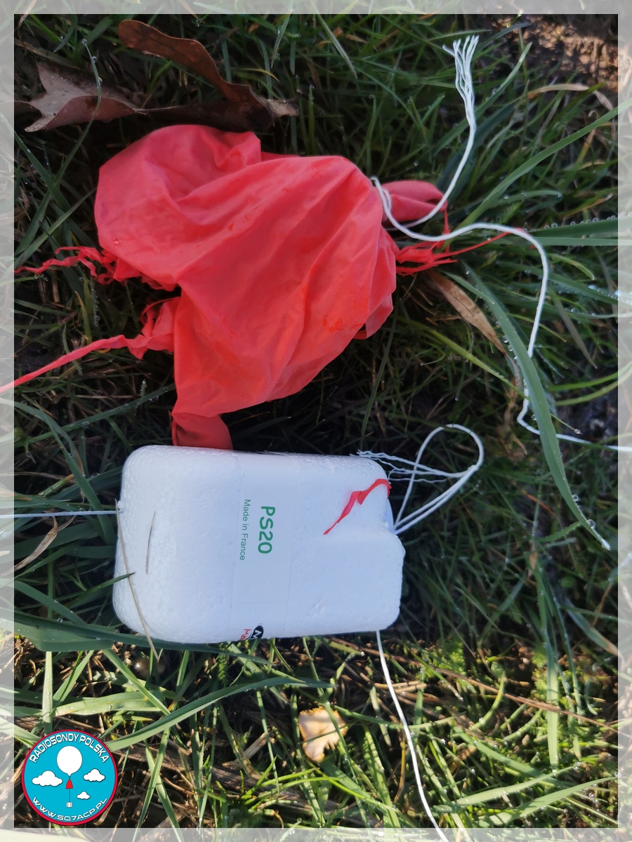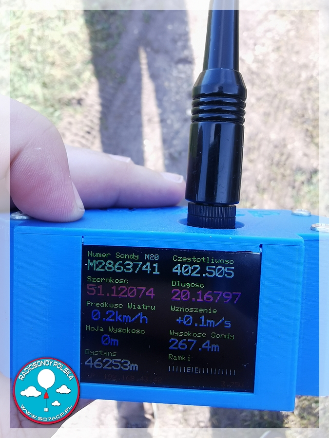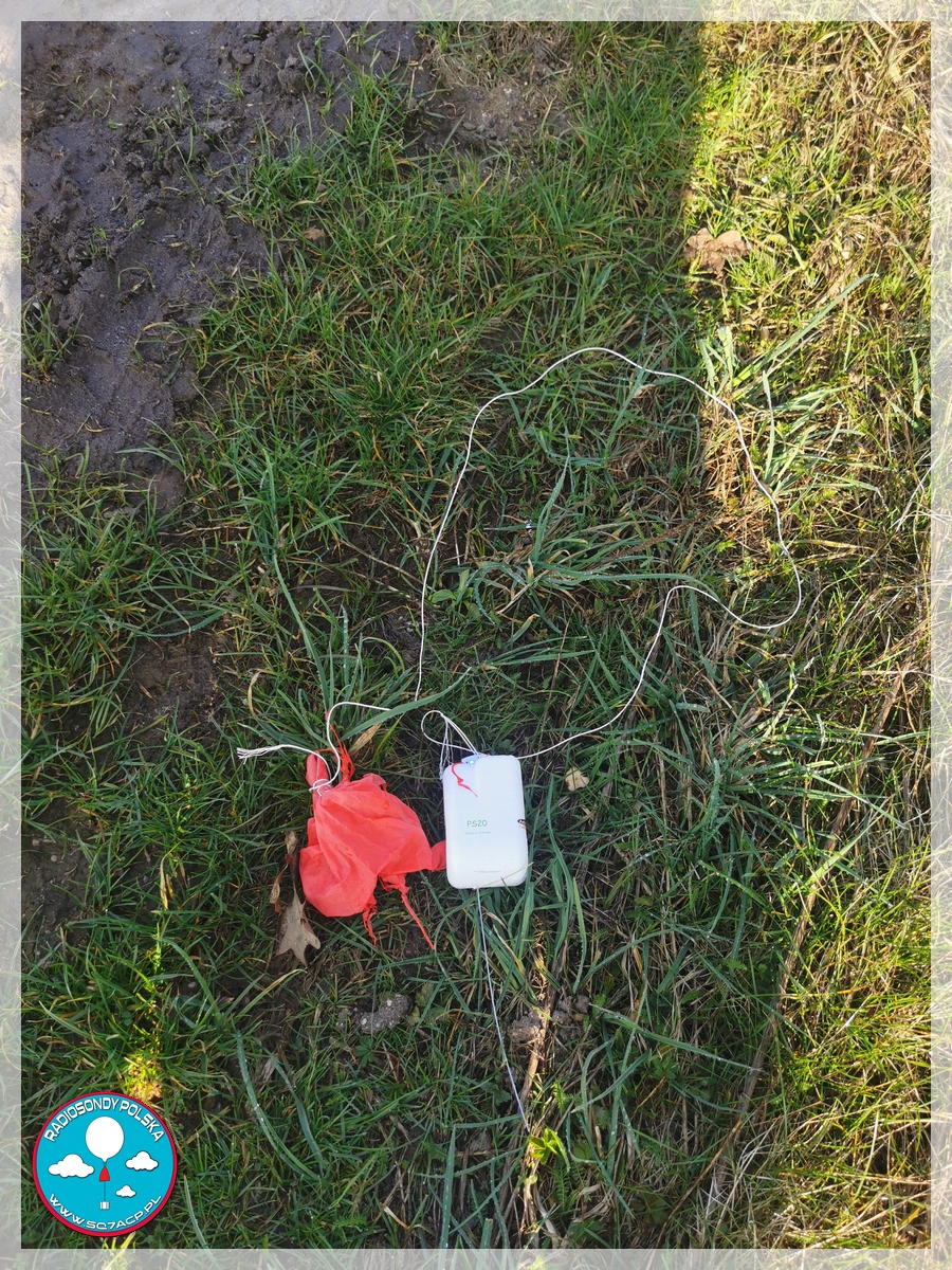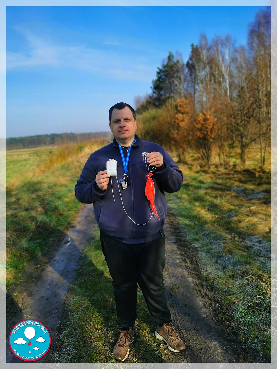 Na ostanie tygodnie marca jest wydany Notam na pilotki z lotniska w Nowym Glinniku. 20 marca po godzinie 6 rano skaner zatrzymał się wydając charakterystyczne pikanie. Początkową radość szybko zgasiły jednak predykty, wiatry górą (koło 10km nad ziemią) są spore i dochodzą do 100 km/h. Sonda za to szybko się wznosi więc jest szansa że może szybciej pęknie. Tak tez się stało na wysokości niemal 12km, nad miejscowością Żarnów. Zapadła szybka decyzja o wyjeździe, w ten piękny słoneczny, mroźny poranek. W nocy temperatura spadła do -3 stopni, więc i szyby w aucie przymarznięte. Zabraliśmy ze sobą ekwipunek, ttgo, radio, antenę kierunkową z tłumikiem i ruszamy w trasę drogą 713. Przed nami jakaś godzina drogi, po drodze w radio słychać, że mają być jakieś blokady rolników na drogach, więc boczkiem , boczkiem i lecimy. Ruch na ulicach w sumie znikomy, więc w miarę szybko jesteśmy już w pobliży sondy. Słychać ja już z odległości 2km, co sugeruje że może wisieć i raczej wisi. One mają bardzo słaby sygnał raczej jak M20. Droga polna prowadzi nas pod samą sondę, jakby upadła bliżej z 3m drogi to prosto z auta by się udało podjąć 🙂 TTGO zdekodowało pozycję bezbłędnie, sam natomiast nie mógł początkowo złapać swojej pozycji i pokazał śmieszną odległość do sondy ponad 4 tysięcy km hahaha.