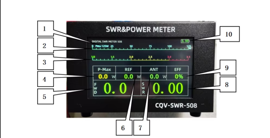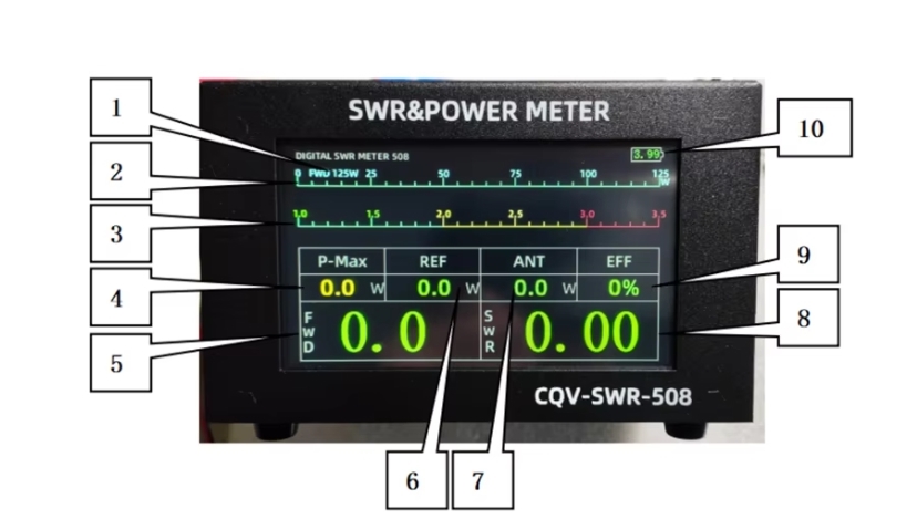 1. Nazwa urządzenia / 2. Bargraf poziomy Mocy  / 3. Bargraf poziomy SWR  / 4. Wskaźnik Mocy maksymalnej  /  5. Forward – fala padająca  / 6. Reflected – fala odbita   / 7. Moc „wychodząca” w antenę
