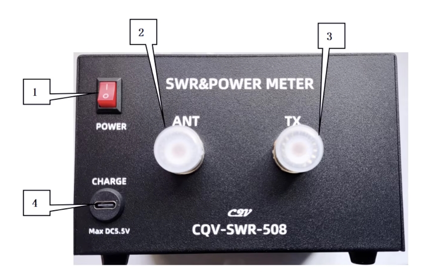 1. Włącznik urządzenia    2,3. Gniazda antenowe TX i ANT   4. Gniazdo Ładowania USB-C