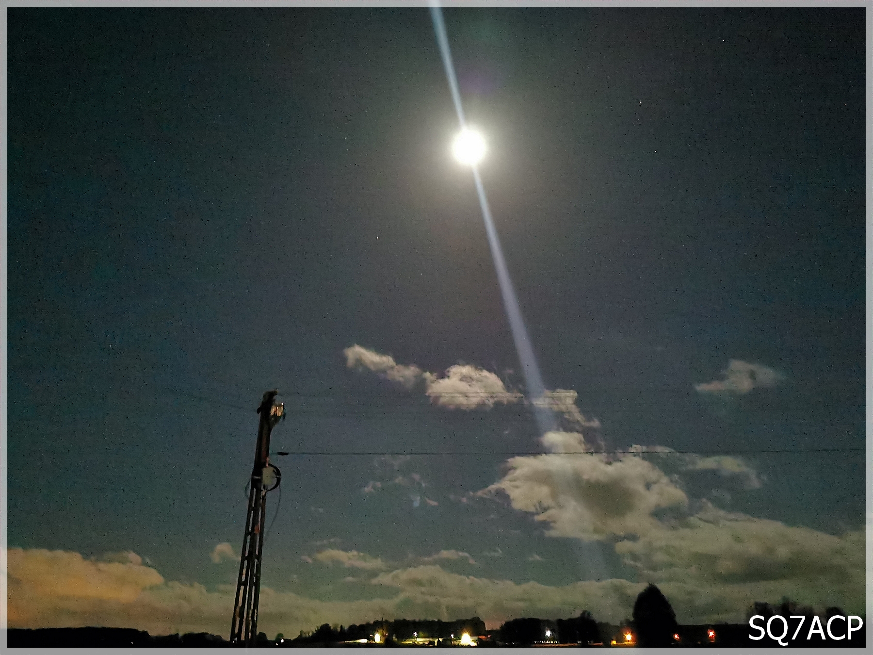 W ten czas nad Polską dominowały silne wiatry nie tylko przy ziemi ale i tam hen wysoko. Wydano liczne ostrzeżenia o silnych podmuchach, trzeba było uważać. Silniejsze wiatry to szansa na złapanie być może jakiejś sondy ? No zobaczymy jak to dalej się potoczy. Dzień wcześniej też dość mocno wiało, zarówno w dzień jak i po zmierzchu. I tej nocy nie było inaczej, wiatr świszczał dość mocno. Predykt może nie był obiecujący ale popatrzeć zawsze można co się wydarzy tam na górze. Sonda sobie wystartowała i leci, osiąga maksymalną wysokość 34359 m nad ziemią. Leciała sobie w naszą stronę ze średnią prędkością prawie 116 km/h oraz maksymalną 224 km/h. O dziwo sonda dolatuje bardzo blisko ale też bardzo szybko zaczyna opadać. Pękła na wysokości Bełchatowa i doleciała do miejscowości Łaknarz. Mimo niesprzyjającej pogody postanowiliśmy sobie zafundować nocną wyprawę, bo to nam się trafia strasznie rzadko. Po kilkunastu minutach jesteśmy na miejscu, mając na uwadze każde drzewo stojące przy drodze z uwago na wiatr. Dojechaliśmy do początku wioski przy pięknie świecącym księżycu.
