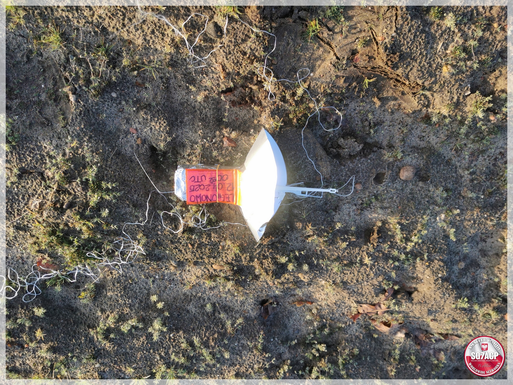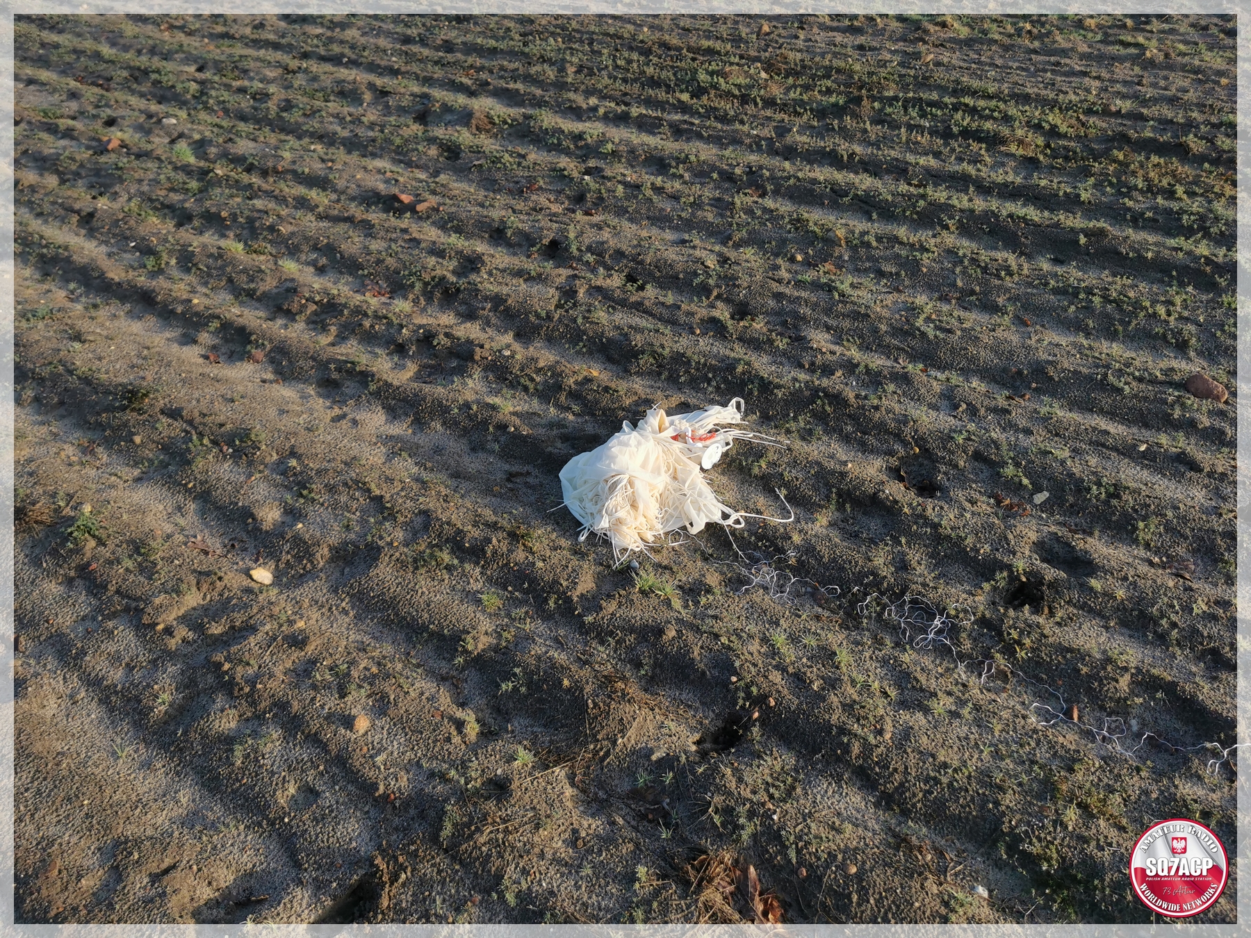 Mało tego że ślad był na skos przez całe pole to w pewnym momencie ślady zakręcały wręcz pod sama sondę 🙂 jakby rolnik wiedział że coś tu spadnie niedługo hihihi 🙂 TAK TAK TAK ! To ona 🙂 KEBAB jak się patrzy 🙂 Nic tylko ugryźć 🙂 Pierwsze co to robię fotki, odcinam sondę, tato poszedł po balon i zaczął zwijać sznurek.