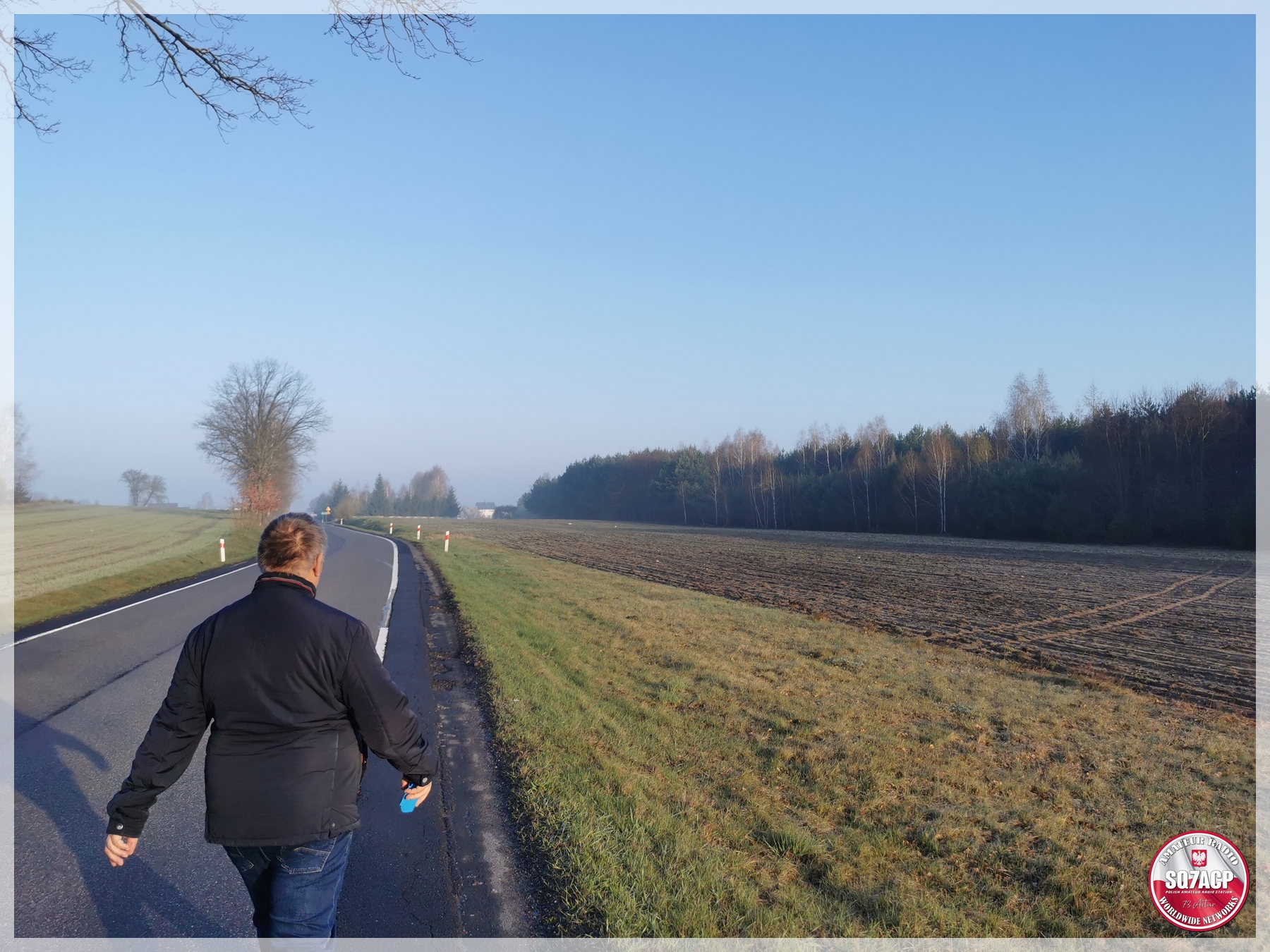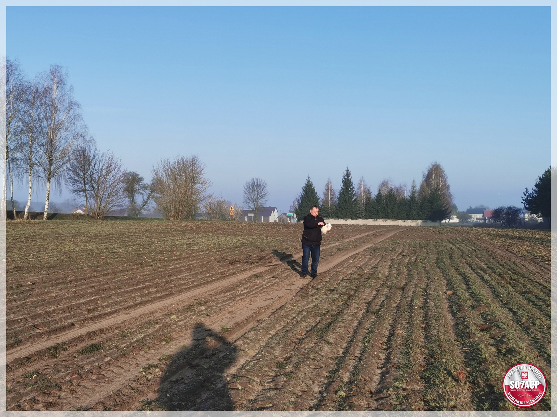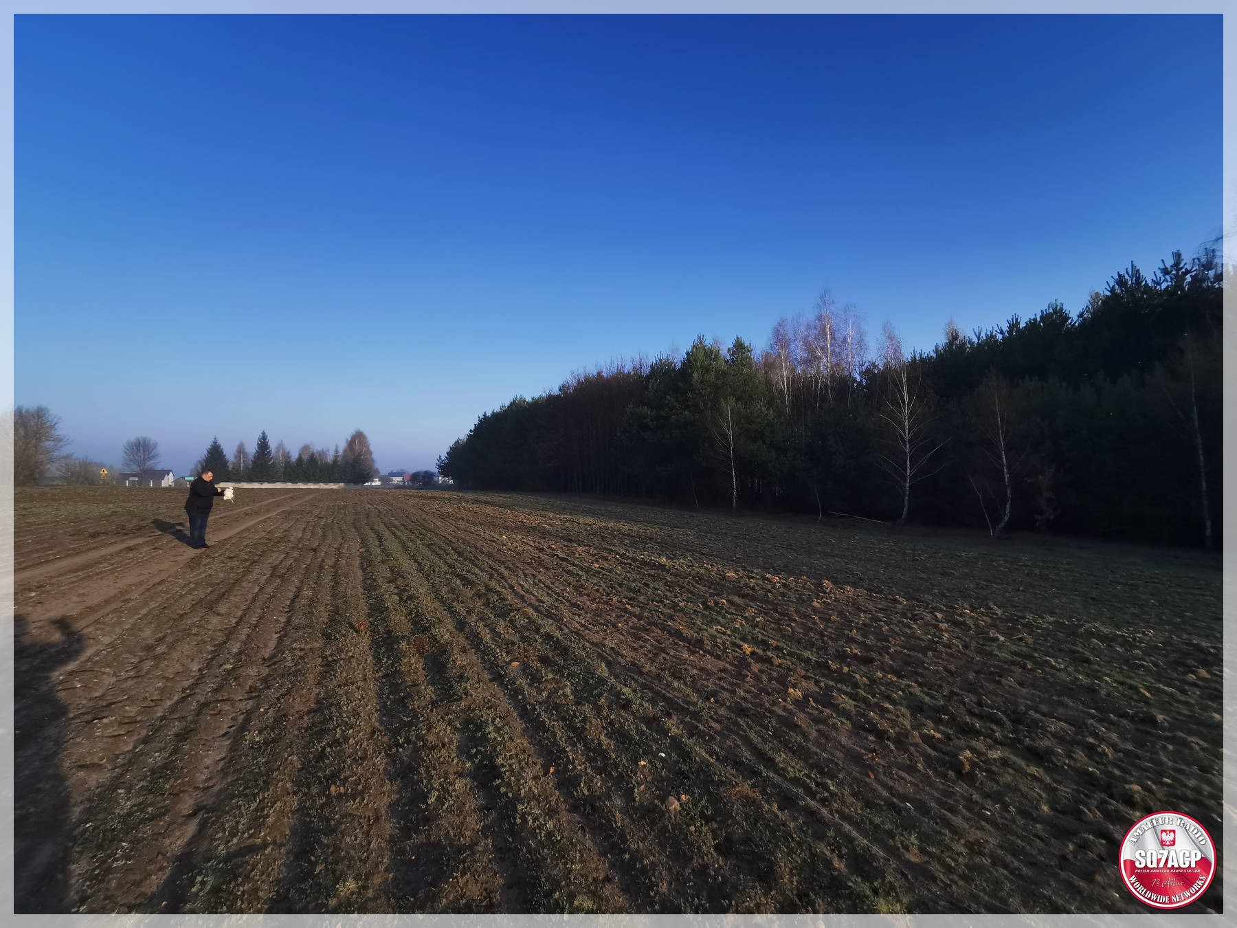 Sonda nadaje słychać pikanie w radio 🙂 Musiałem przejechać miejsce upadku radiosondy jakieś 100m z powodu głębokich rowów tuz przy drodze, nic to jest zjazd do lasku tu zostawiamy auto. Idziemy, sondę i balon widać już daleka, na polu są ślady traktora podążamy więc nimi by nic nie zadeptać rolnikowi.