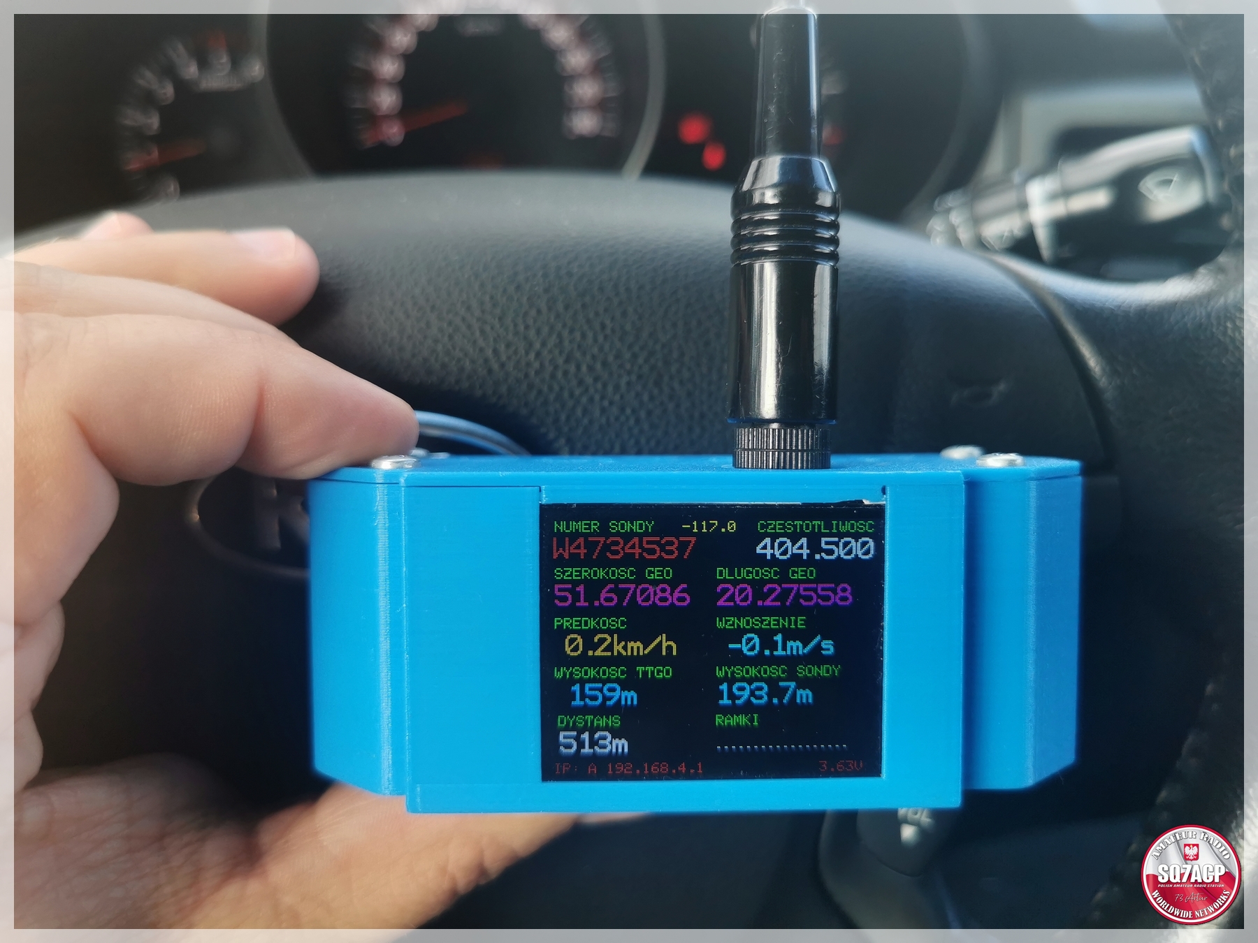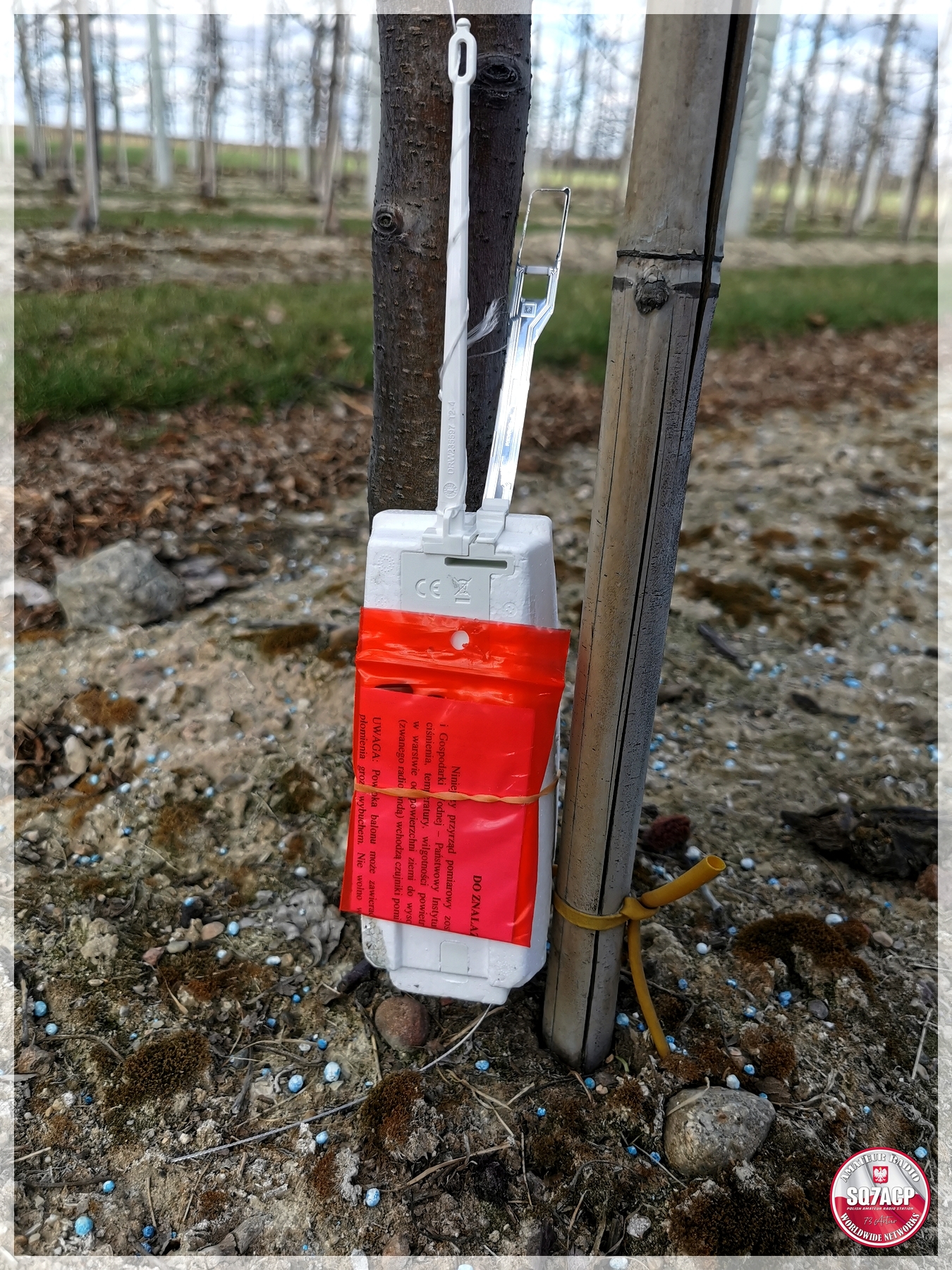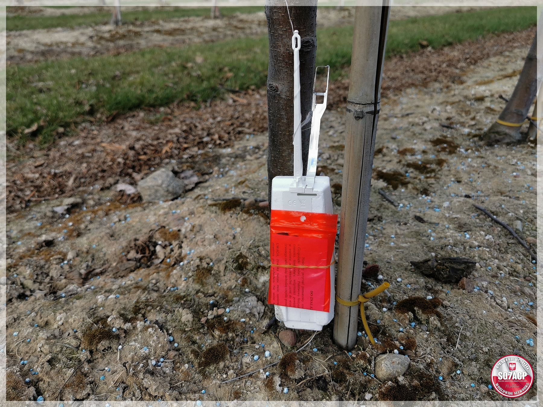 TTGO łapie ramkę z pozycją. Po dojeździe okazuje się że radiosonda znajduje się w sadzie, ogrodzonym sadzie. Sad ogrodzony, skobelek zasunięty ale otwarty. No to klops, dla mnie klops. Nie jestem z tych co by sobie odsunęli skobelek i weszli jak do siebie – o nie. Co innego jeśli sad jest otwarty bez ogrodzenia a nikogo nie ma w pobliżu. Wtedy można zaryzykować, no chyba że akurat ktoś pracuje w sadzie to sprawa się sama rozwiązuje.