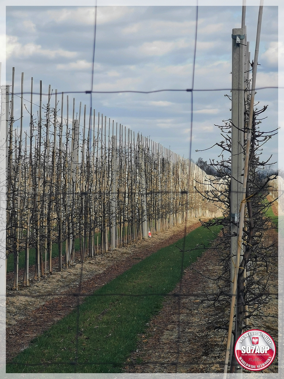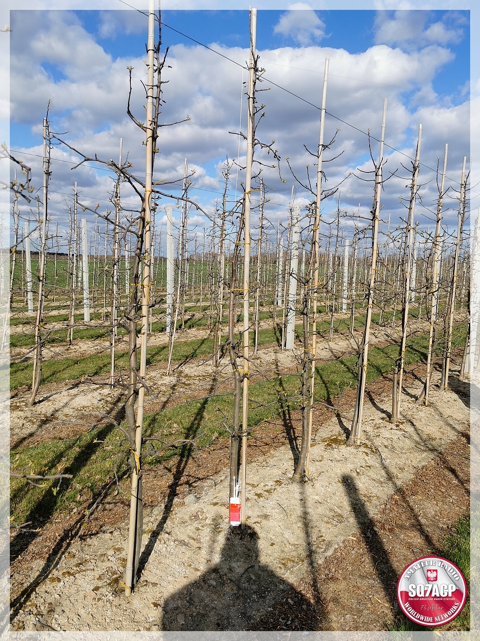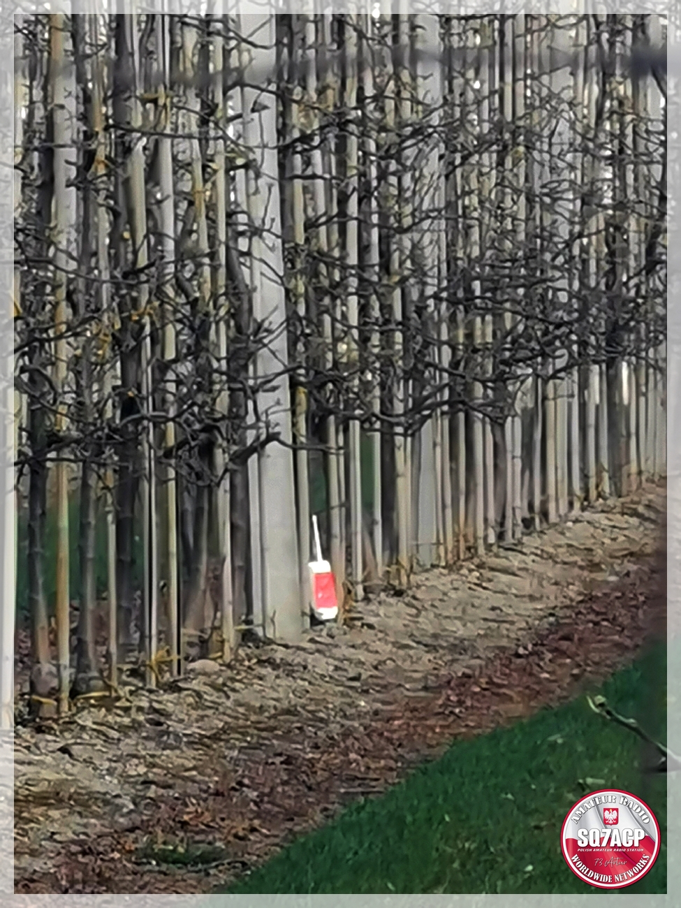 Podjeżdżam pod sad, wysiadamy żeby otworzyć bramę, podjeżdża auto. Spojrzałem a to znajoma twarz kolegi z Radomia. Idziemy po sondę , ta sobie wisi kila centymetrów nad ziemią oplątana o drzewko jabłoni, sznurek napięty górą, nad linkami naciągowymi do drzewek, prowadzi dalej do sadu. Kolega poszedł po to co zostało z drugiej strony, w sumie nic tam nie zostało. Znalazł sam rozwijak praktycznie kawałek szyjki no i sznurek, flaczka nie było kompletnie nic można rzec. Porobiłem sobie zdjęcia, wyszliśmy z sadu, zamknęliśmy tak jak był, porozmawialiśmy z kolegą.